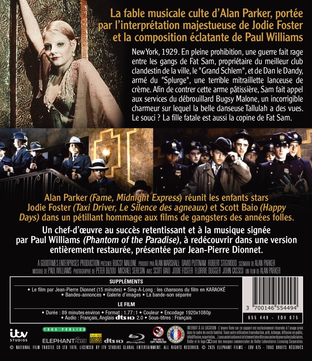 Alan Parker (Fame, Midnight Express) réunit les enfants stars Jodie Foster (Taxi Driver, Le Silence des agneaux) et Scott Baio (Happy Days) dans un pétillant hommage aux films de gangsters des années folles. Un chef-d’œuvre au succès retentissant et à la musique signé par Paul Williams (Phantom of the Paradise), à redécouvrir dans une édition collector et une version entièrement restaurée, présentée par Jean-Pierre Dionnet.