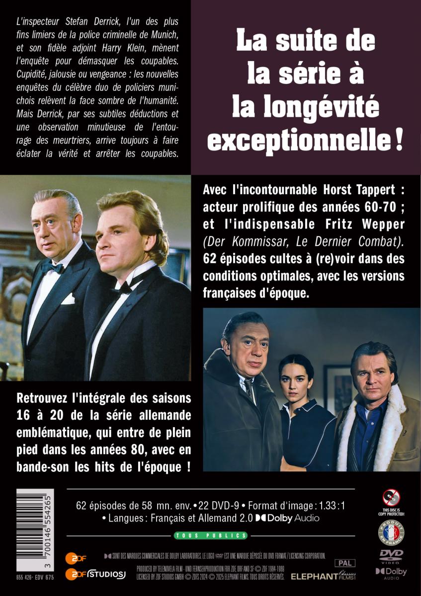 Retrouvez l'intégrale des saisons 16 à 20 de la série allemande emblématique, qui entre de plein pied dans les années 80, avec en bande-son les hits de l'époque ! Avec l'incontournable Horst Tappert : acteur prolifique des années 60-70 ; et l'indispensable Fritz Wepper (Der Kommissar, Le Dernier Combat). 62 épisodes cultes à (re)voir dans des conditions optimales, avec les versions françaises d'époque.