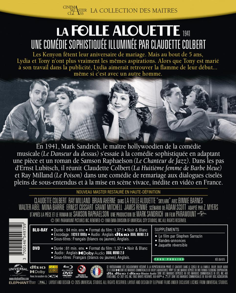 En 1941, Mark Sandrich, le maître hollywoodien de la comédie musicale (Le Danseur du dessus) s'essaie à la comédie sophistiquée en adaptant une pièce et un roman de Samson Raphaelson (Le Chanteur de Jazz). Dans les pas d'Ernst Lubitsch, il réunit Claudette Colbert (La Huitième femme de Barbe bleu) et Ray Milland (Le Poison) dans une comédie de remariage aux dialogues ciselés pleins de sous-entendus et à la mise en scène vivace, inédite en vidéo en France.
