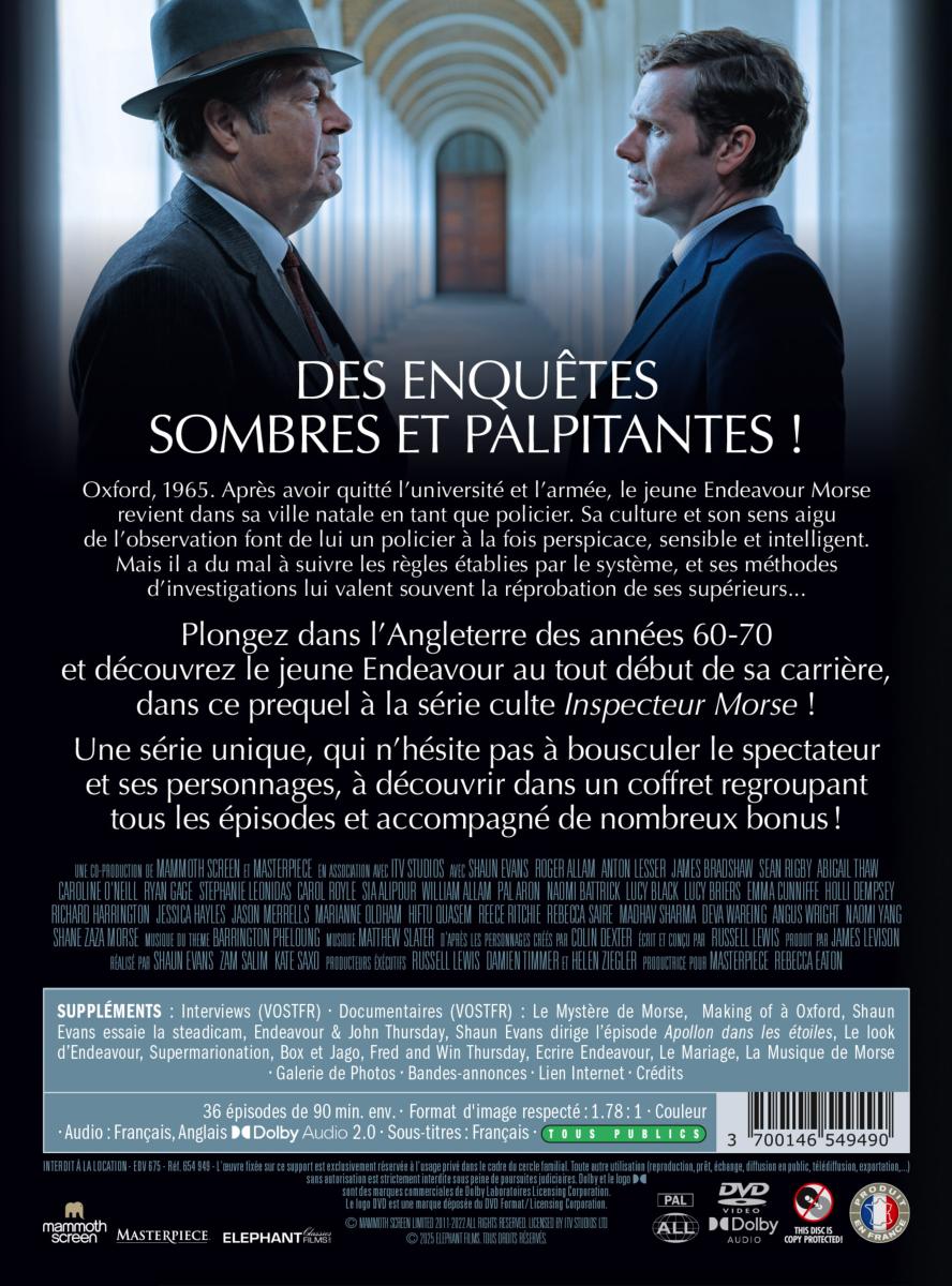 : Interviews (VOSTFR) - Documentaires (VOSTFR) : Le Mystère de Morse, Making of à Oxford, Shaun Evans essaie la steadicam, Endeavour & John Thursday, Shaun Evans dirige l'épisode Apollon dans les étoiles, Le look d’Endeavour, Supermarionation, Box et Jago, Fred and Win Thursday, Ecrire Endeavour, Le Mariage, La Musique de Morse - Galerie de Photos - Bandes-annonces - Lien Internet - Crédits