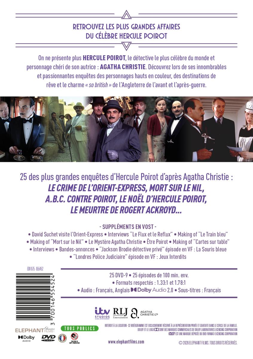 25 des plus grandes enquêtes d’Hercule Poirot d’après Agatha Christie (Le Crime de l’Orient-Express…) Des versions entièrement remasterisées, jamais les aventures du célèbre détective n’avaient été aussi belles ! L’immense David Suchet, la plus célèbre incarnation du détective fait étalage de tout son flegme et son talent. Du suspense, des mystères, de l’humour, préparez-vous pour des voyages inoubliables